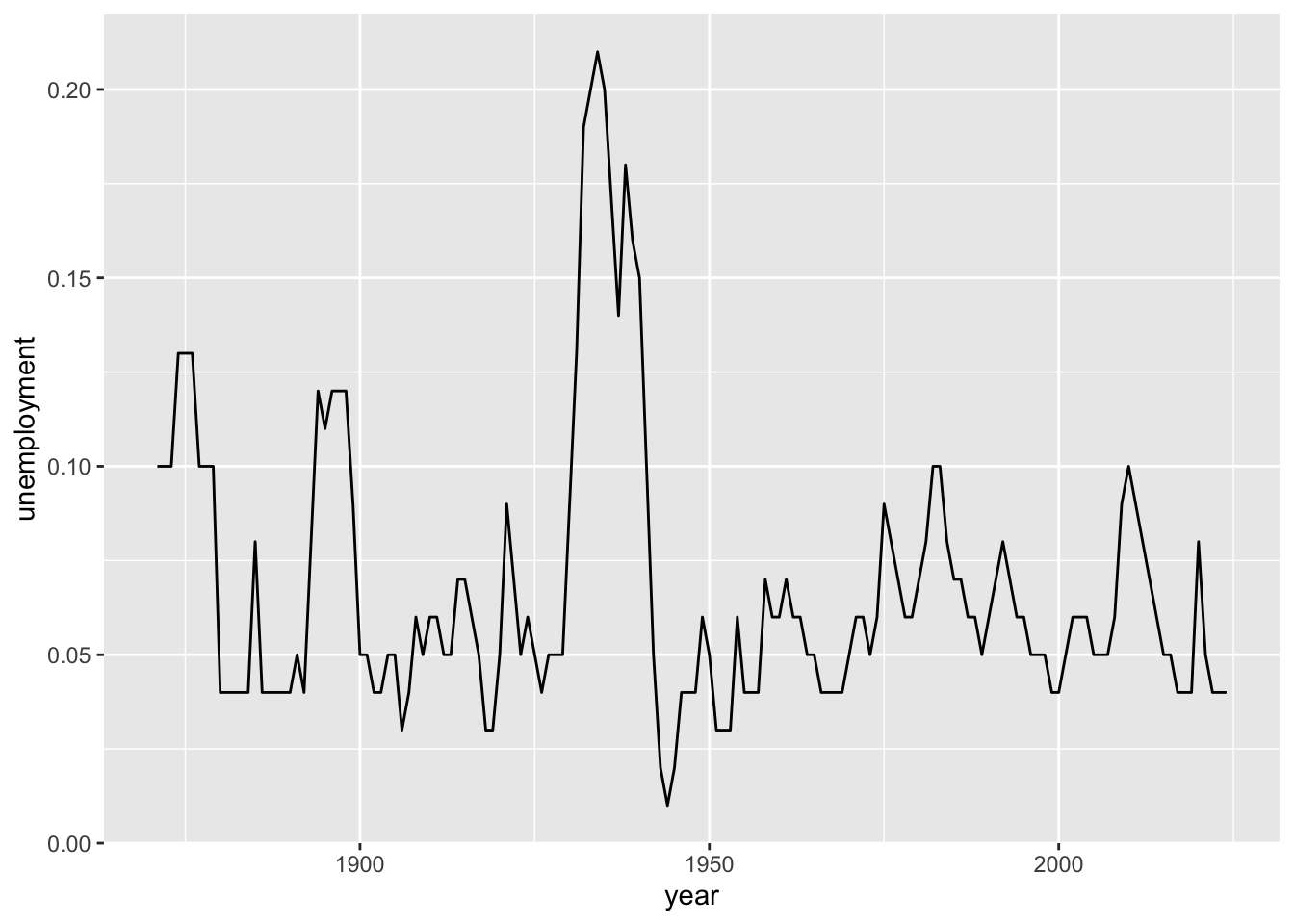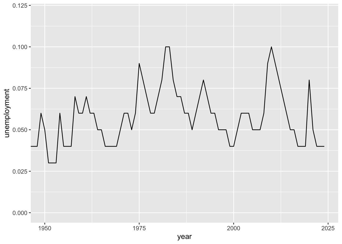 ggplot(macro, aes(x = year, y = unemployment)) +
