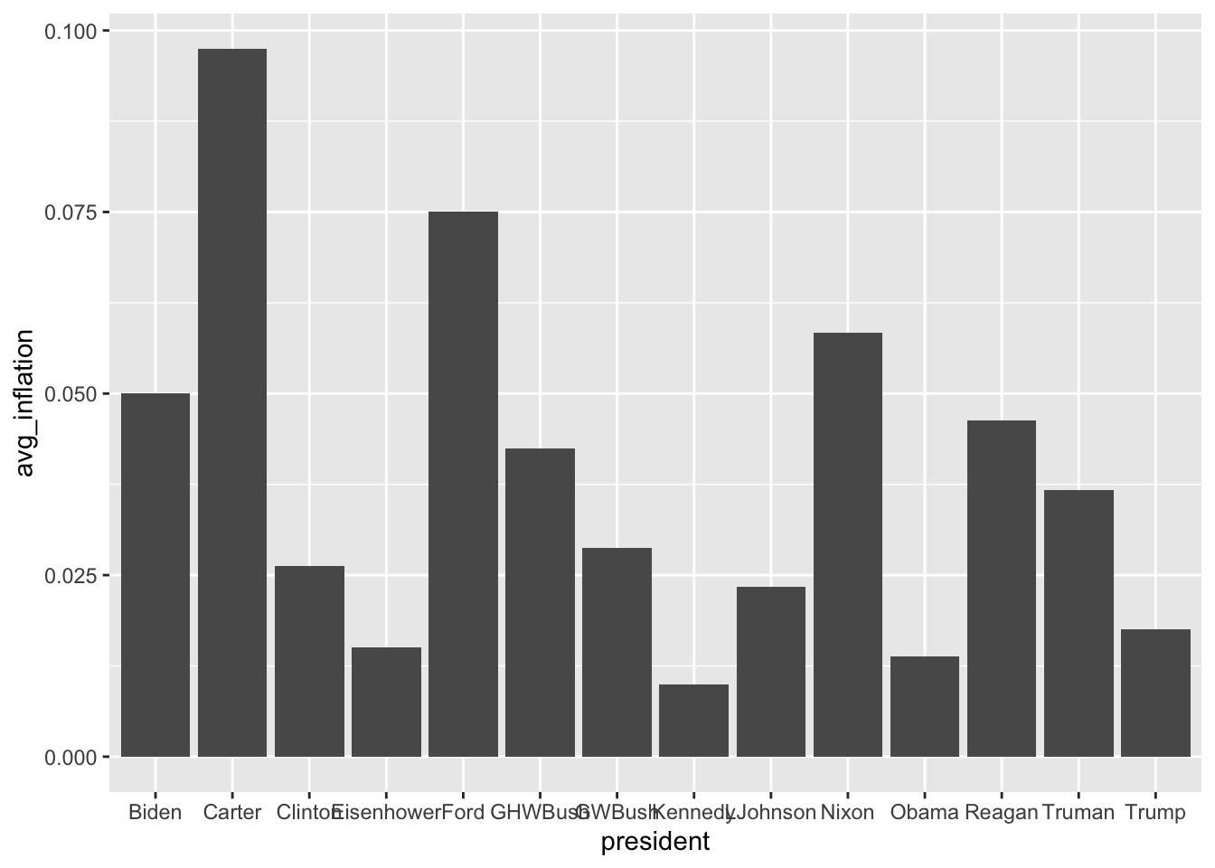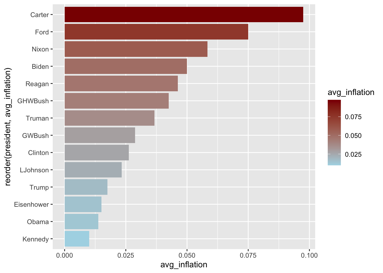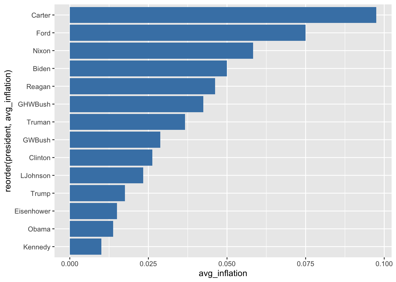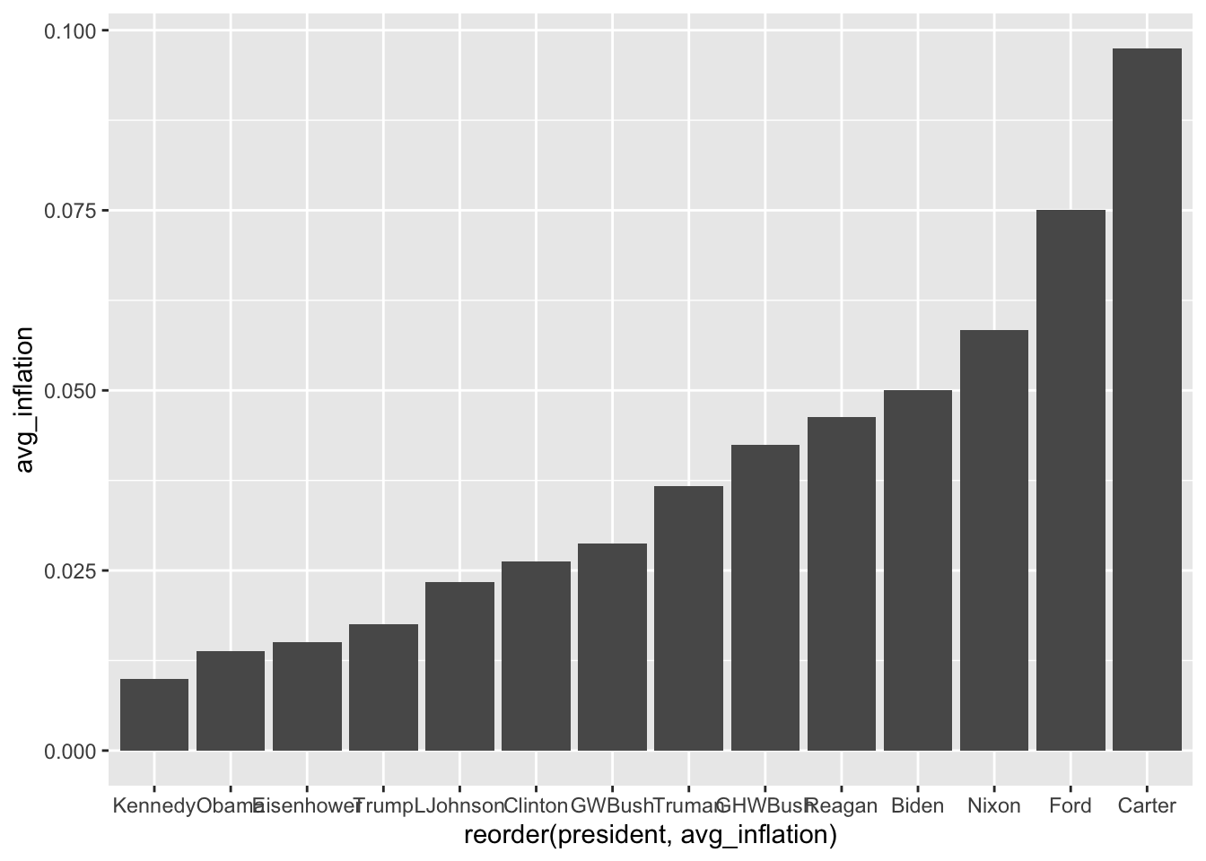 ggplot(president_inflation, aes(x = reorder(president, avg_inflation),