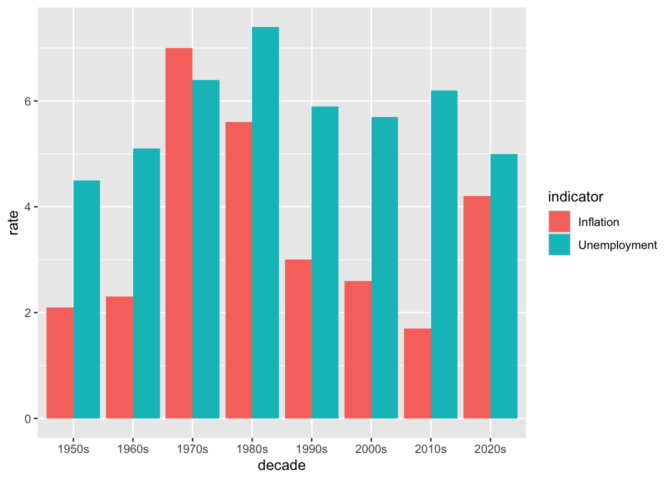 In economic applications, bar charts are useful for comparing summary statistics across groups. You might compare average GDP growth rates across countries, unemployment rates across demographic groups, or government spending across budget categories. Bar charts work well for showing rankings (which president had the highest average inflation?) and for displaying the results of grouped calculations. Grouped and stacked bar charts extend this further by allowing comparisons across two categorical dimensions simultaneously—for example, comparing both inflation and unemployment across decades. When categories have long labels (like country names or policy descriptions), horizontal bar charts improve readability by giving the labels room to display fully.