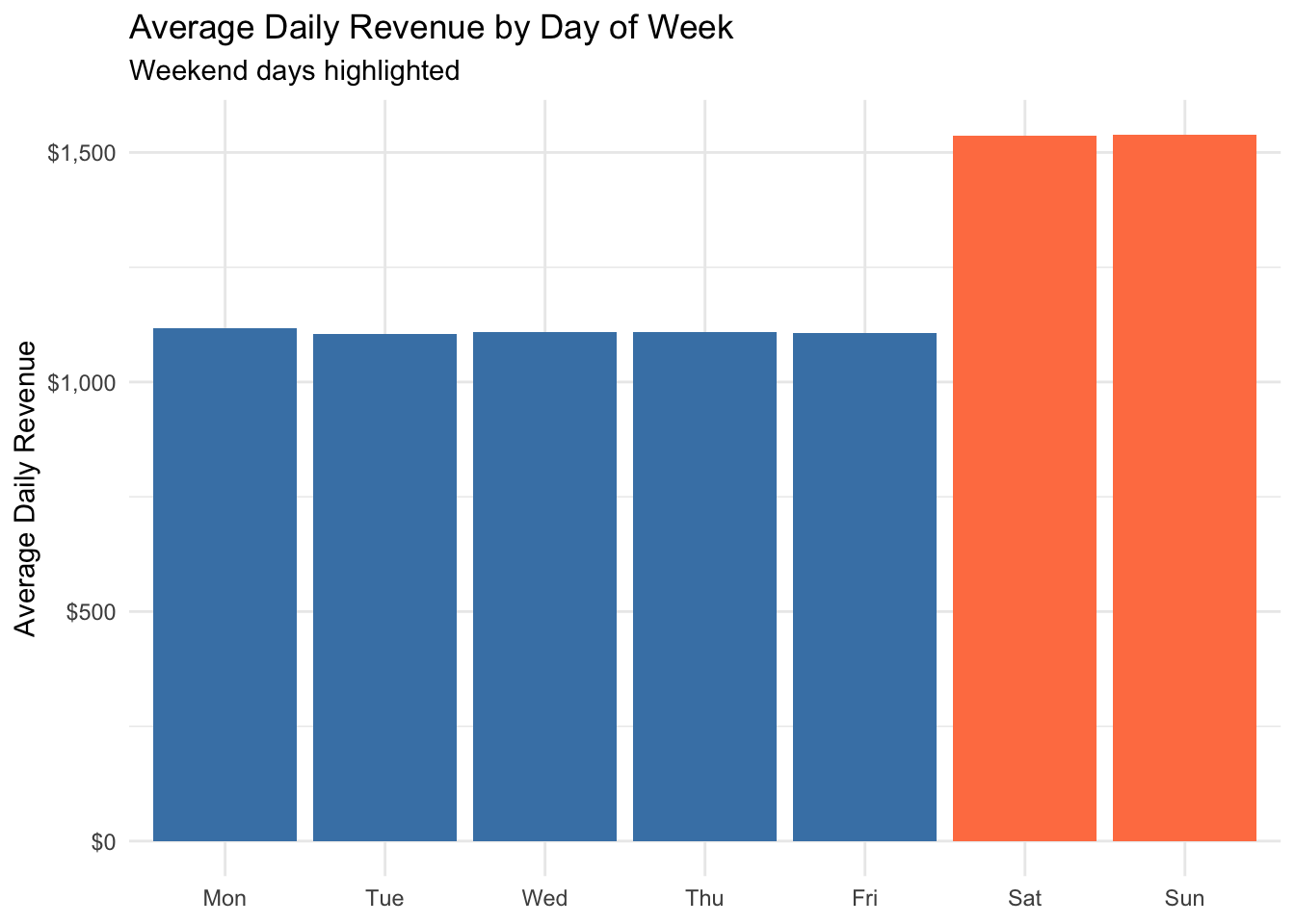 ggplot(aes(x = day_of_week, y = avg_daily_revenue, fill = day_of_week %in% c("Sat", "Sun"))) +