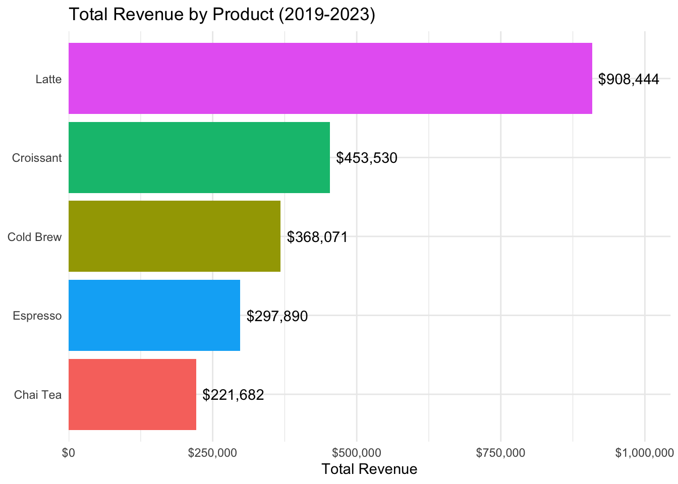 labs(title = "Total Revenue by Product (2019-2023)", x = NULL, y = "Total Revenue") +