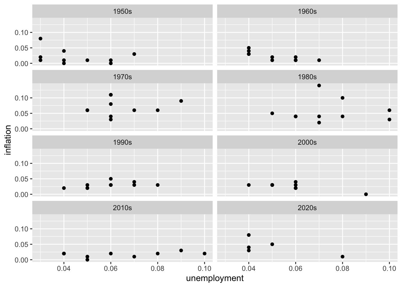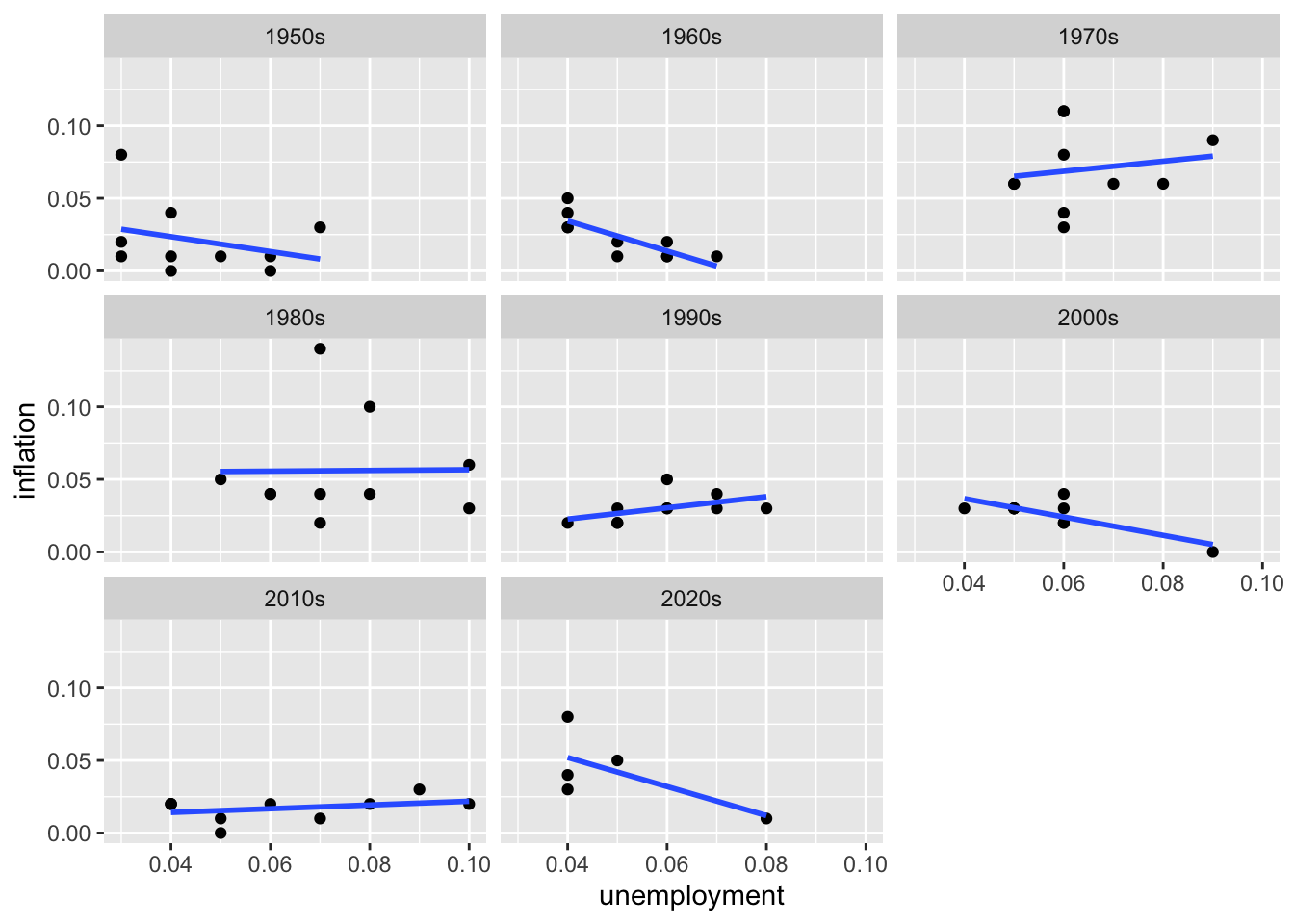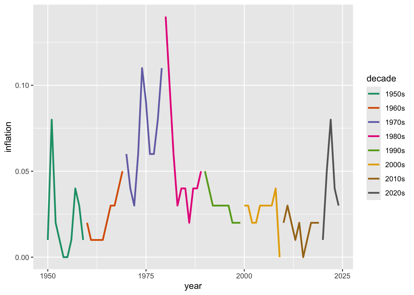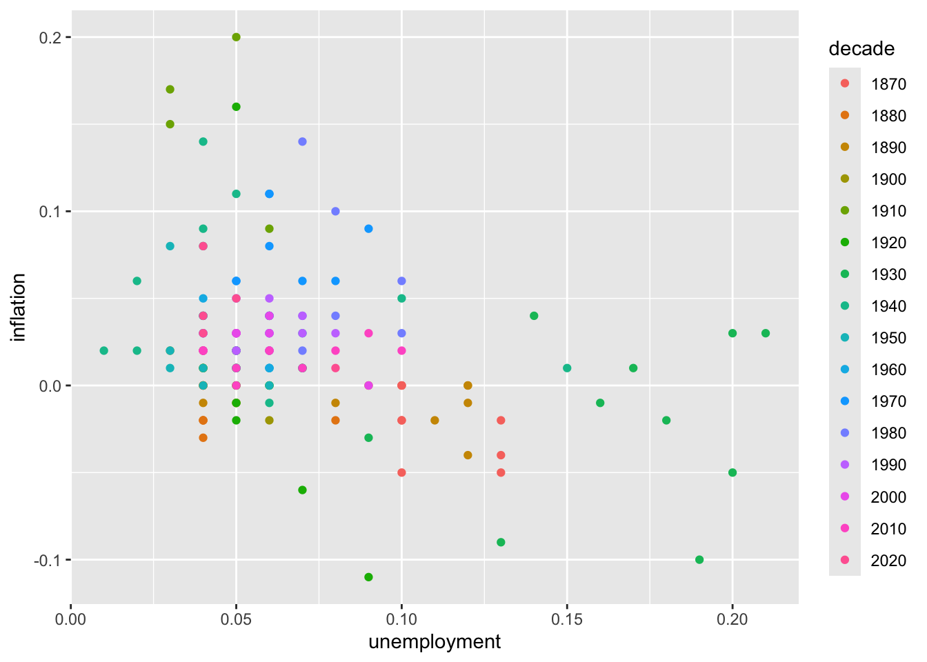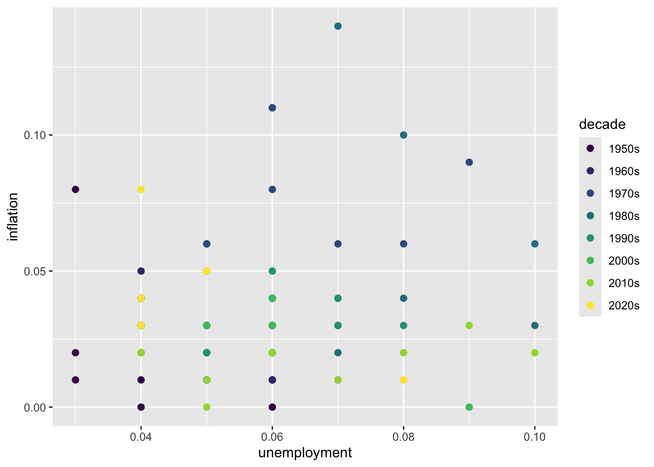 ggplot(macro, aes(x = unemployment, y = inflation, color = decade)) +
