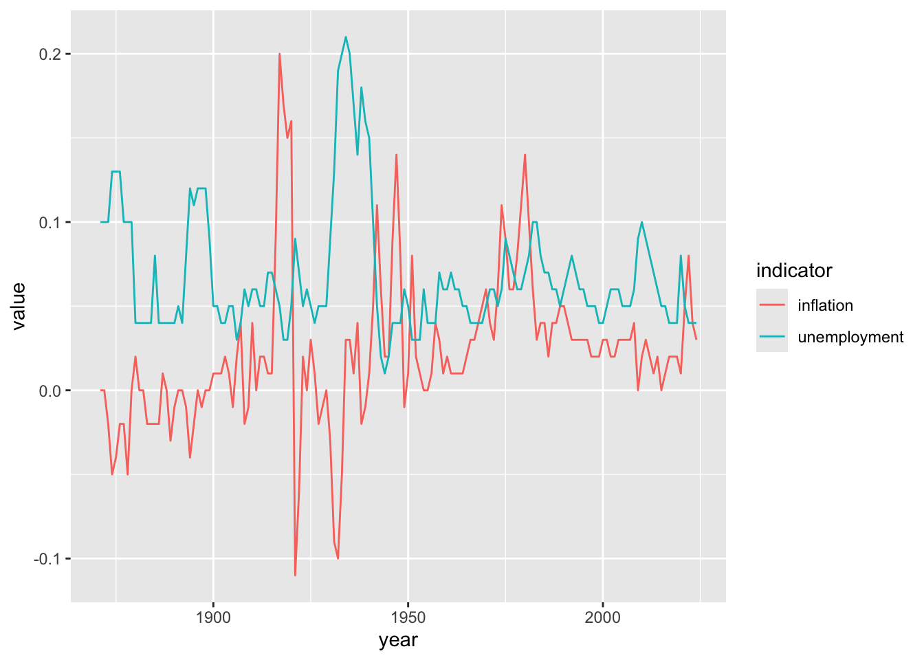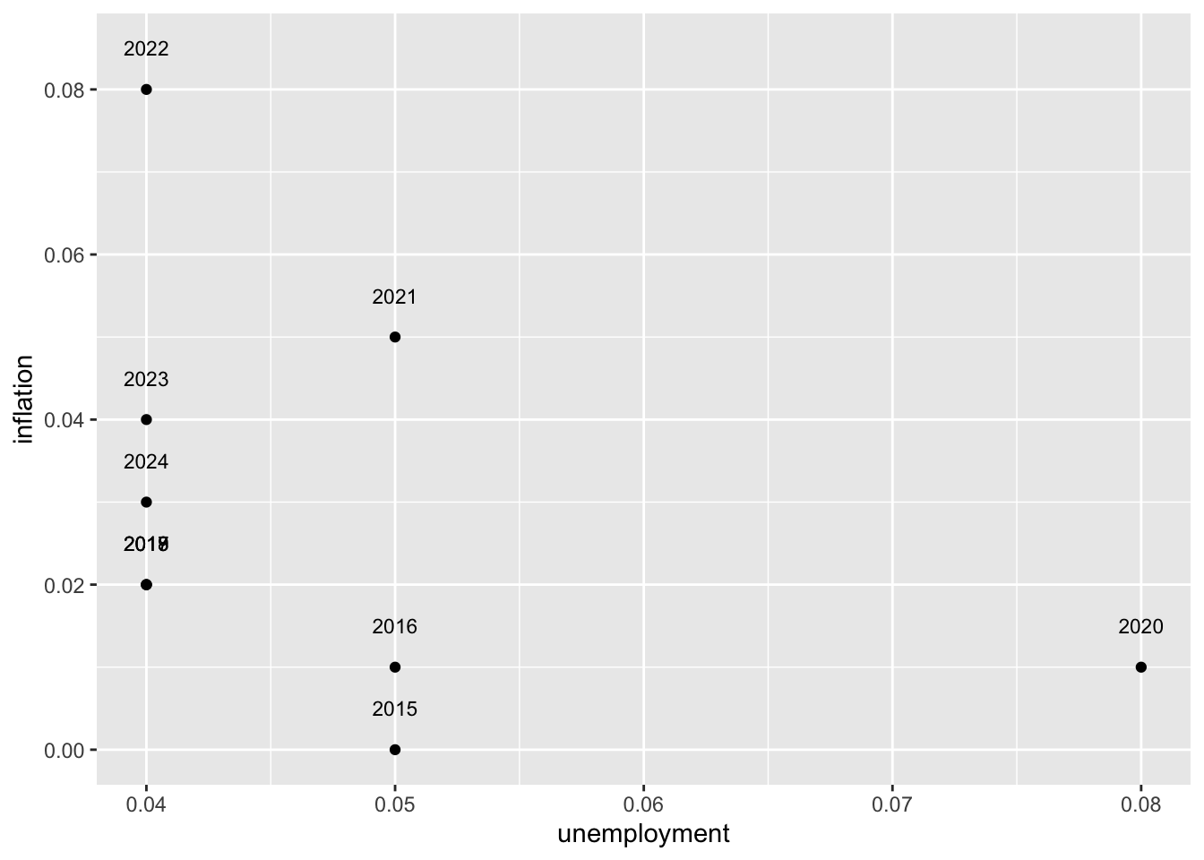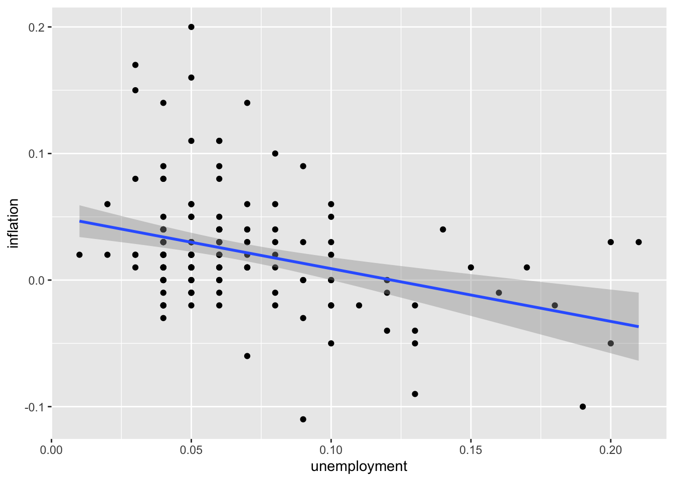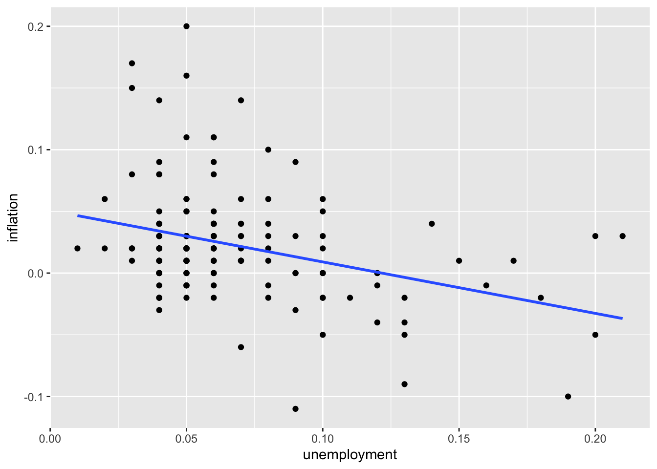 In economics, scatter plots are fundamental for examining relationships between variables. The classic example is the Phillips Curve, which plots unemployment against inflation to explore the hypothesized tradeoff between these two macroeconomic outcomes. Scatter plots can reveal whether relationships are positive, negative, linear, or nonlinear. They also make it easy to spot unusual observations that might warrant further investigation—such as years with stagflation (high unemployment and high inflation simultaneously) that deviate from typical patterns. By adding trend lines, you can visualize the average relationship and assess how well a linear model fits the data.