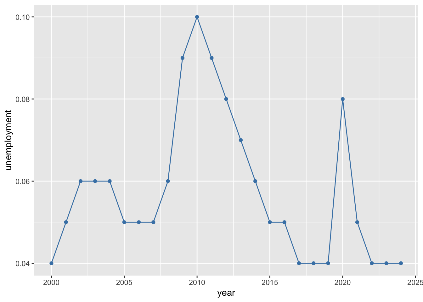 ggplot(macro %>% filter(year >= 2000), aes(x = year, y = unemployment)) +