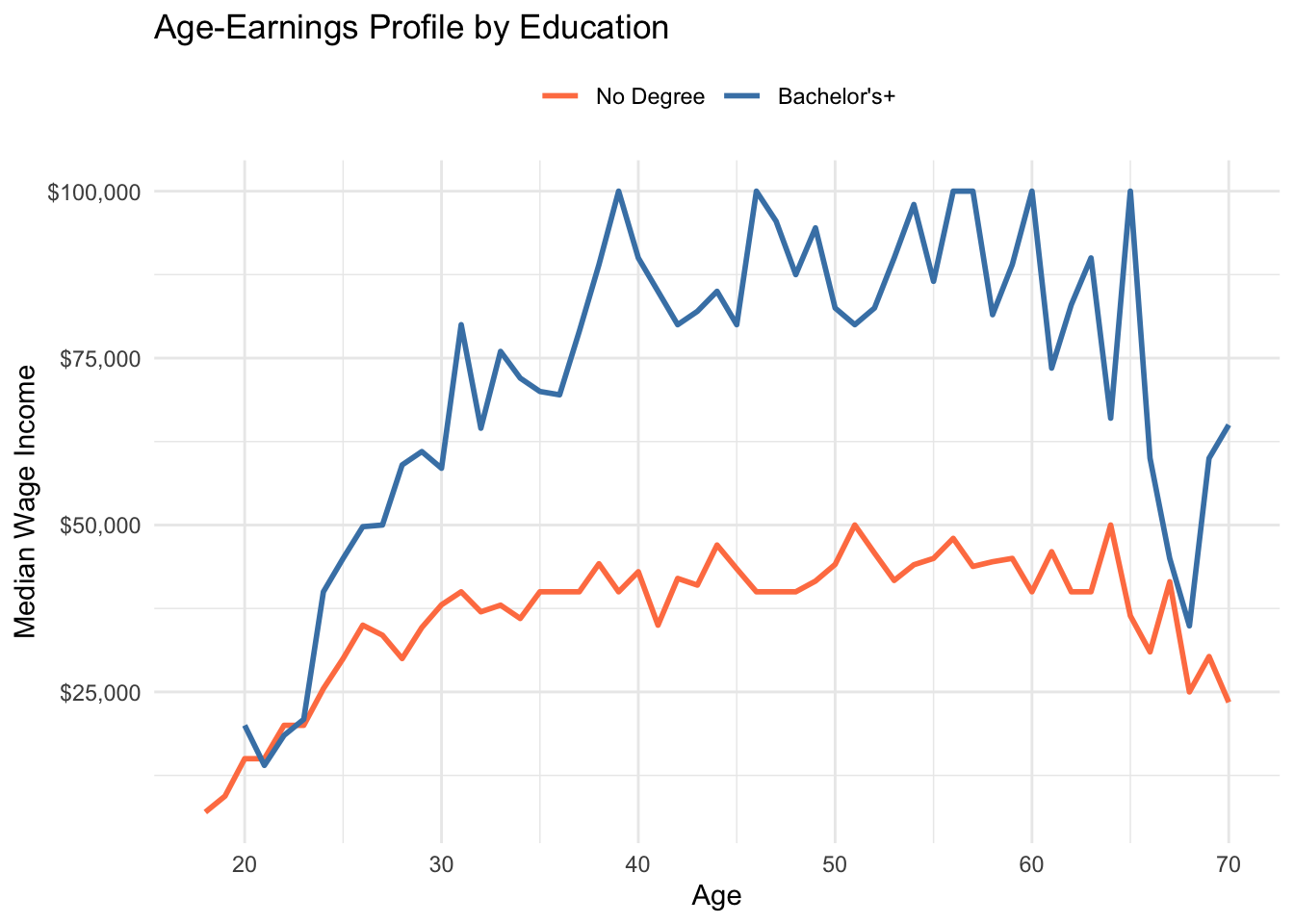 ggplot(aes(x = age, y = median_wage, color = has_degree)) +