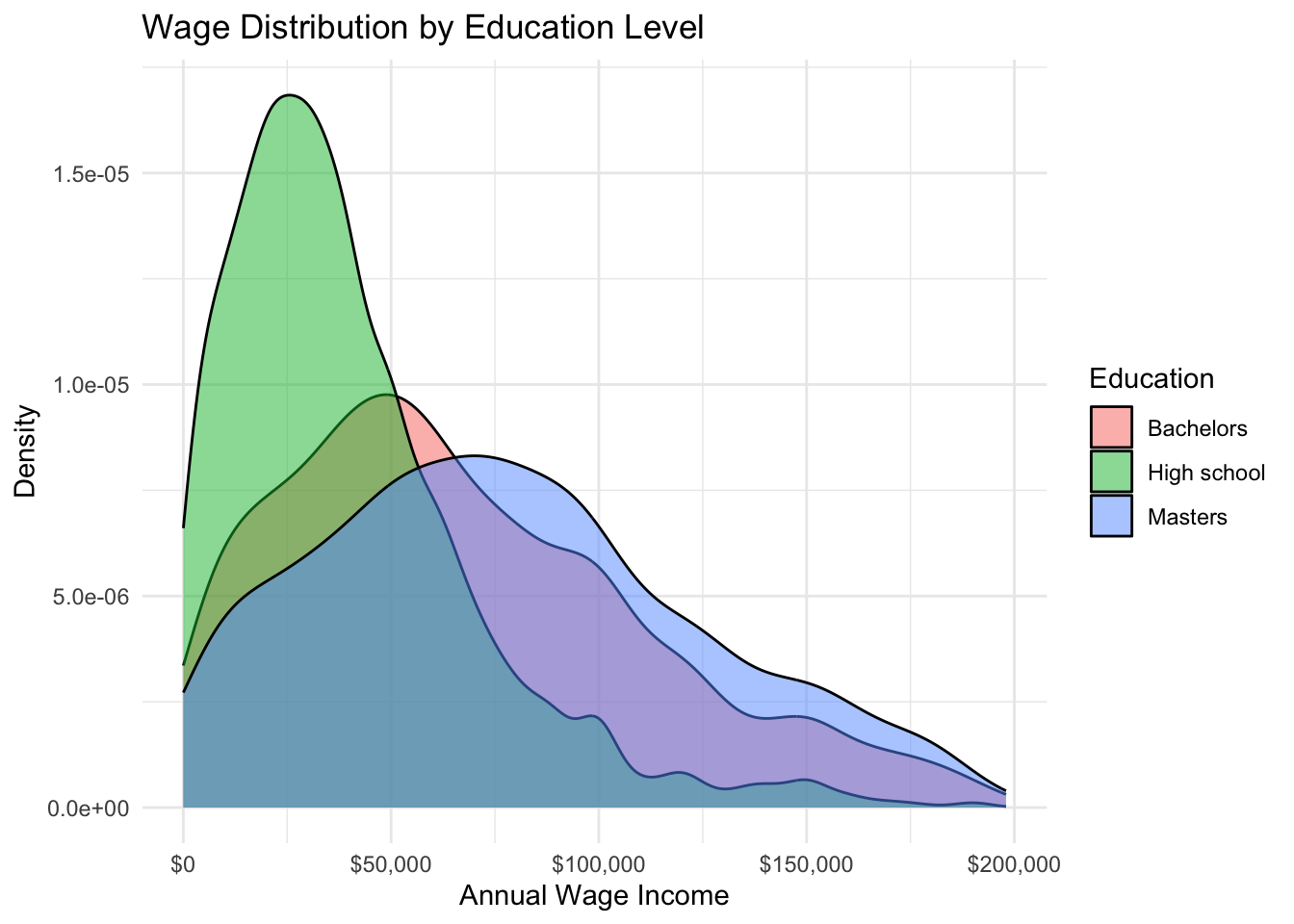 x = "Annual Wage Income", y = "Density", fill = "Education"