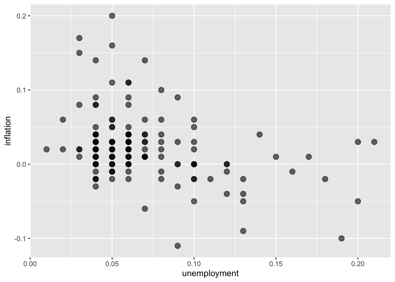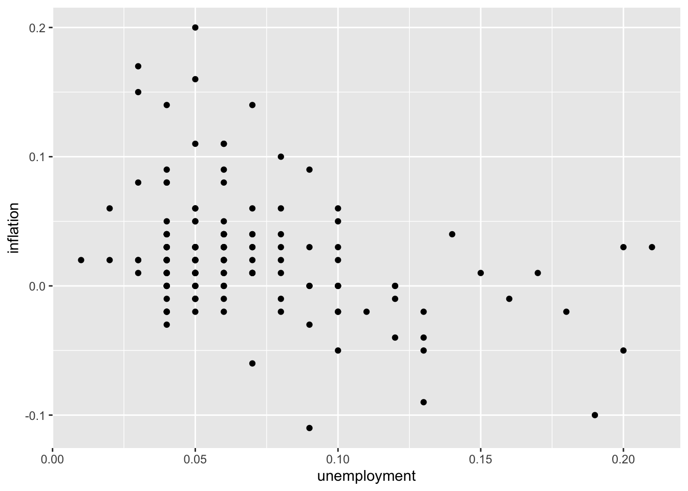 ggplot(macro, aes(x = unemployment, y = inflation)) +