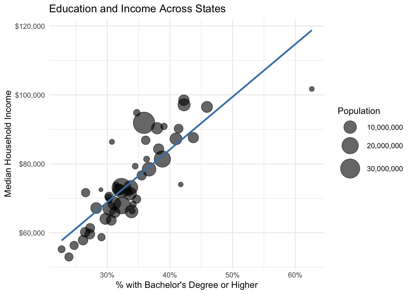 - Aesthetics (aes): Mappings from data variables to visual properties (x position, y position, color, size, shape)